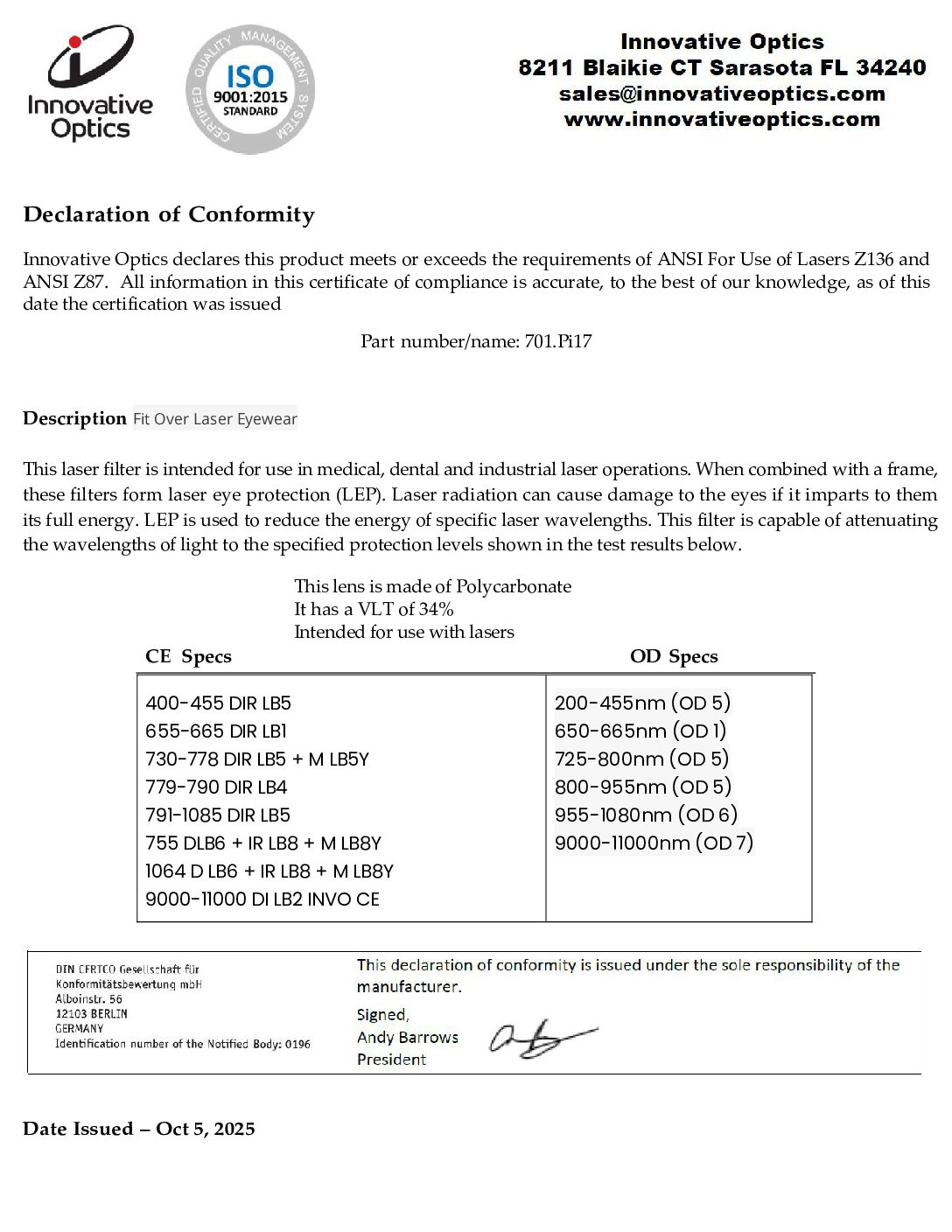 Our 701 Pi17 White laser glasses are designed with great quality and customization in mind. The 701 frame has a universal fit with bendable temples and a fit-over design. The 7 different color options allow you to come up with your own organizational system.