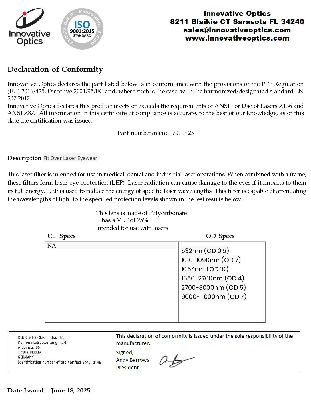 Laser Type: KTP (532 nm OD 0.5), Nd:YAG (1064 nm OD 7), Ho:YAG (2100 nm OD 4), Er:YAG (2940 nm OD 5), CO2 (10600 nm OD 7)