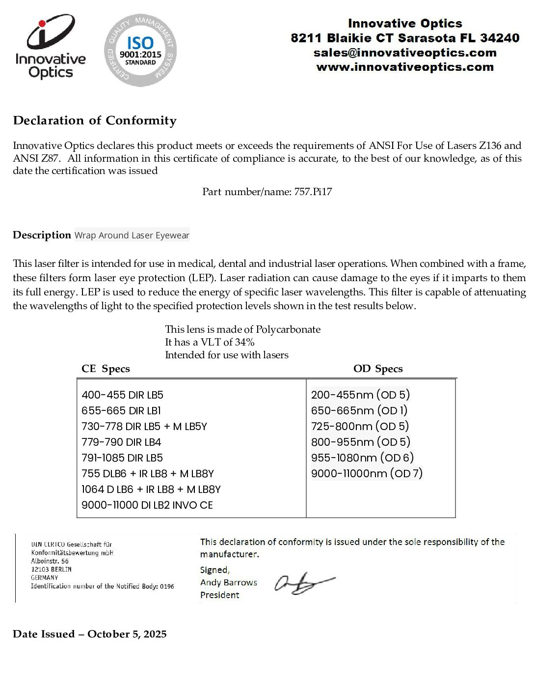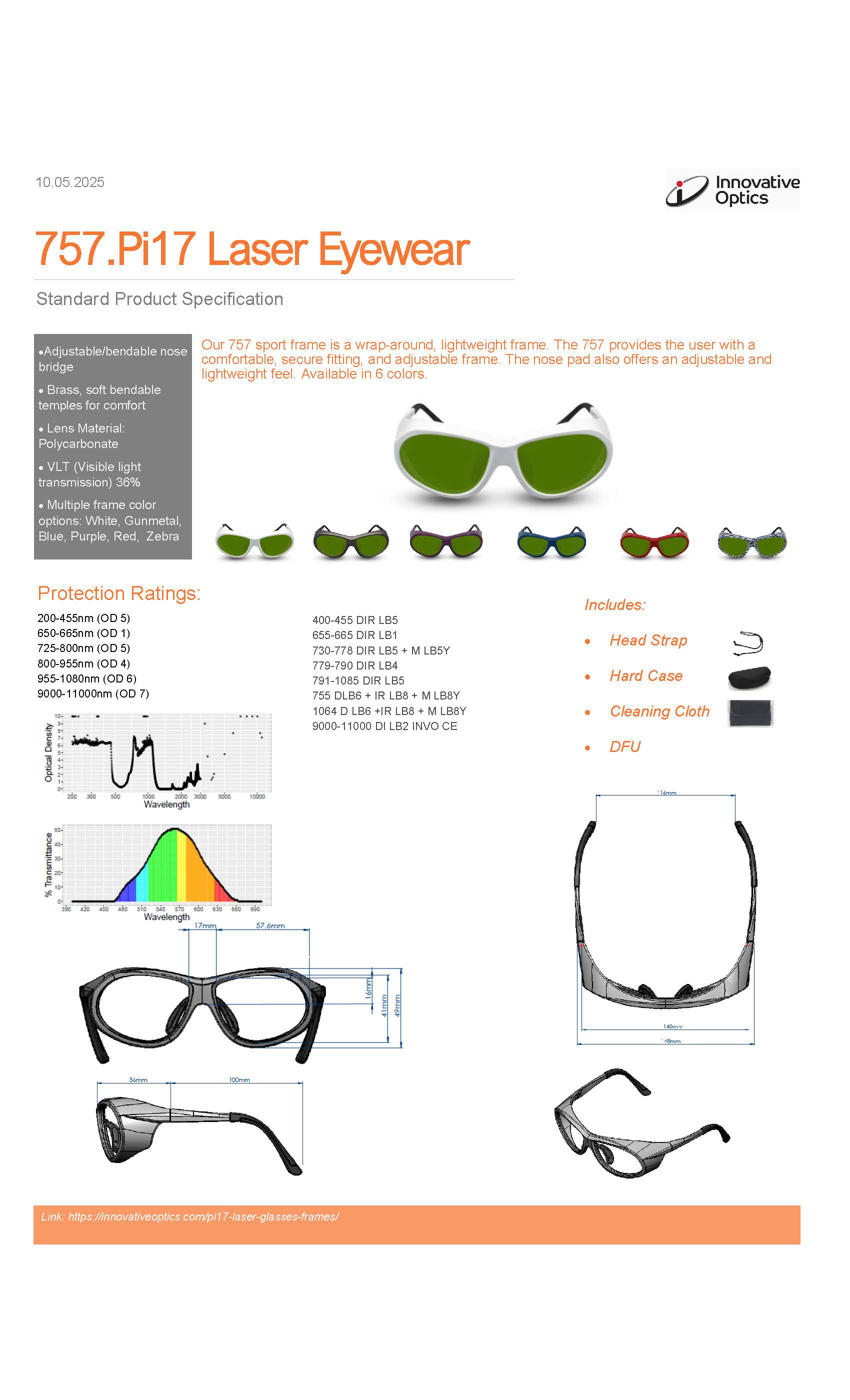 Laser Type: Alexandrite (755 nm OD7), Diode (650 – 665 nm OD2), Diode (940 nm OD 5), Disc (1030 nm OD 6), Faser (976 – 1080 nm OD 6), Nd:YAG (1064 nm OD 7), Ti:Sapphire (800 nm OD5), CO2 (10600 nm OD 7)