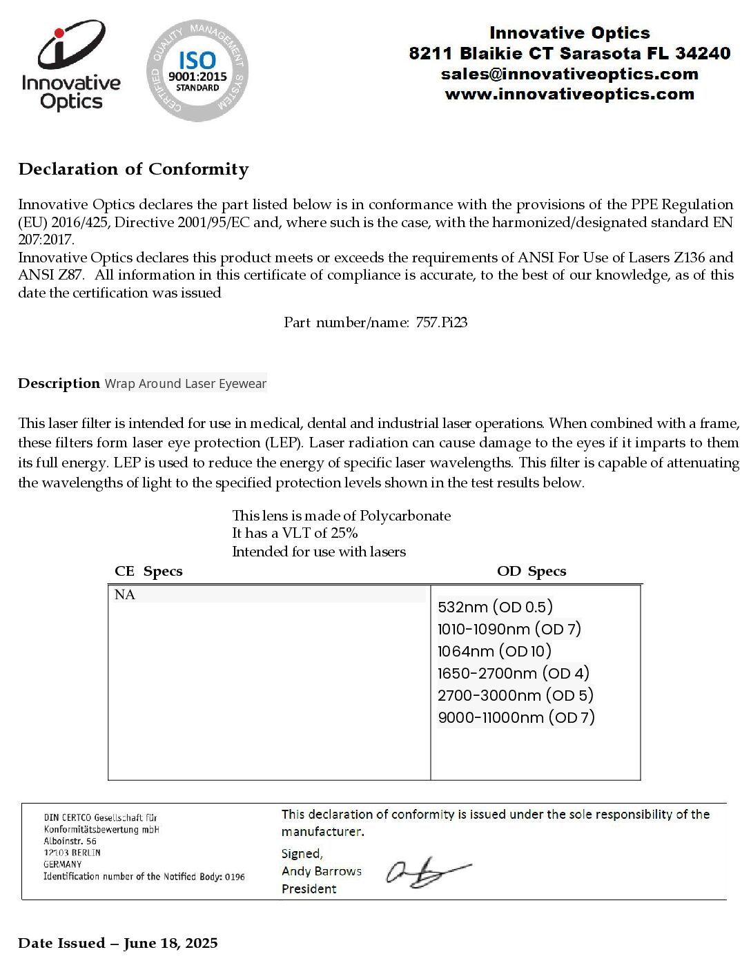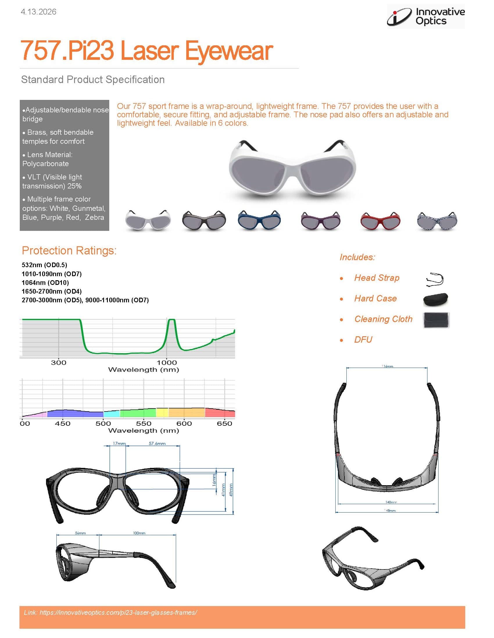 Laser Type: KTP (532 nm OD 0.5), Nd:YAG (1064 nm OD 7), Ho:YAG (2100 nm OD 4), Er:YAG (2940 nm OD 5), CO2 (10600 nm OD 7)