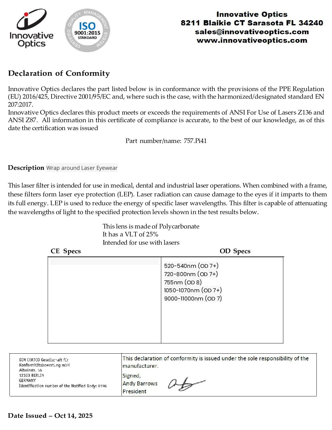 Laser Type: Alexandrite (750-800nm OD 7), Diode (800-830nm OD 5)