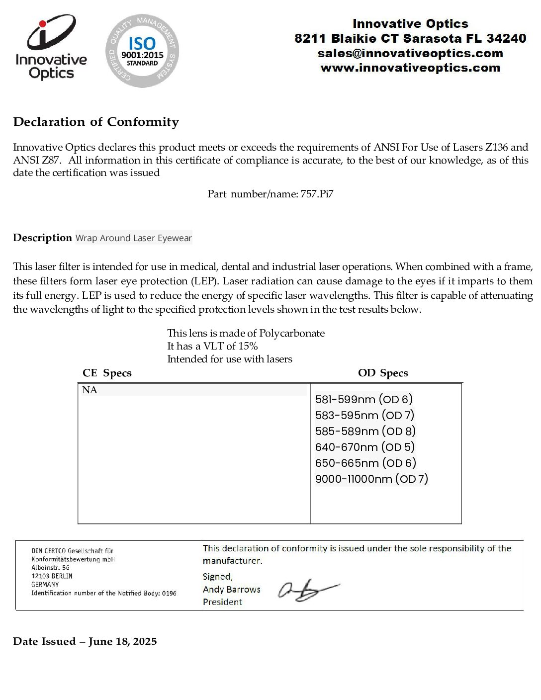 Laser Type: Diode (640-670nm OD 5), DYE (581-589nm OD 6)